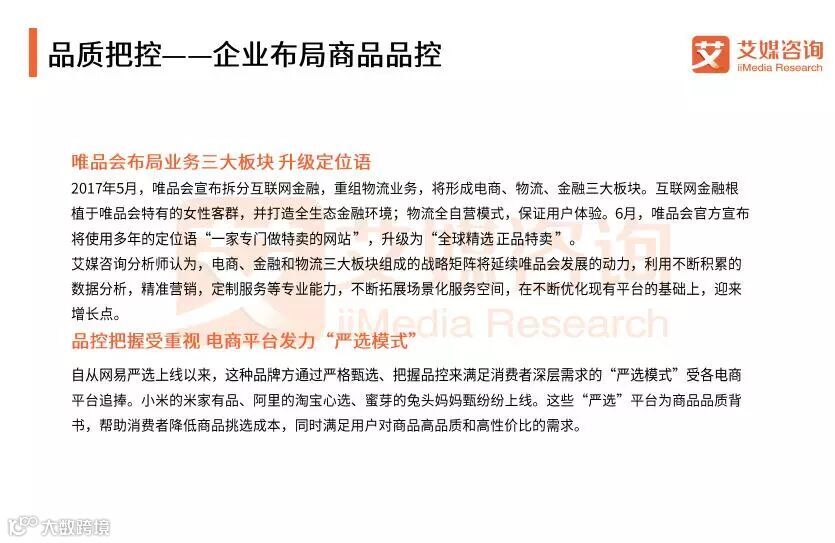 唯品会2017年全年营业收入达到人民币729亿元,较上一年增长28.8%。艾媒咨询分析师认为,唯品会自营货品、自营仓储、自营物流的全自营模式为消费者提供较为良好的网购体验的同时也是唯品会电商、金融、物流的拉动增长的“三驾马车”。除此之外,唯品会还将重心放在了品质把控方面,持续发力,其布局具有长期的发展前景和发展动力。