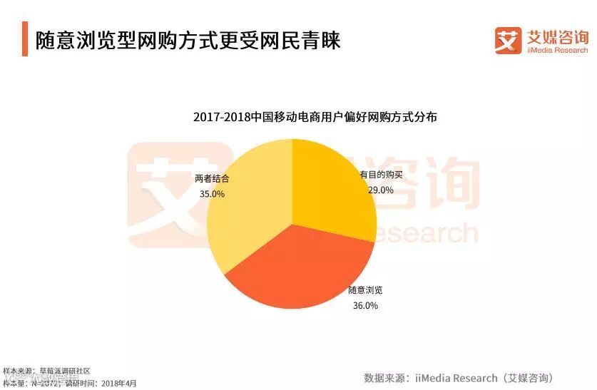 iiMedia Research(艾媒咨询)数据显示,对于用户使用移动电商购物的方式,29.0%的受访用户是有目标地进行购物,随意浏览、碰到合适的商品再购物的用户达到36.0%,35.0%的用户则将两者结合。艾媒咨询分析师认为,随着网购行为越来越普及,以及物流技术发展,电商平台上商品种类丰富度越来越高,用户在电商平台上能发现各类商品,继而进行网购。
