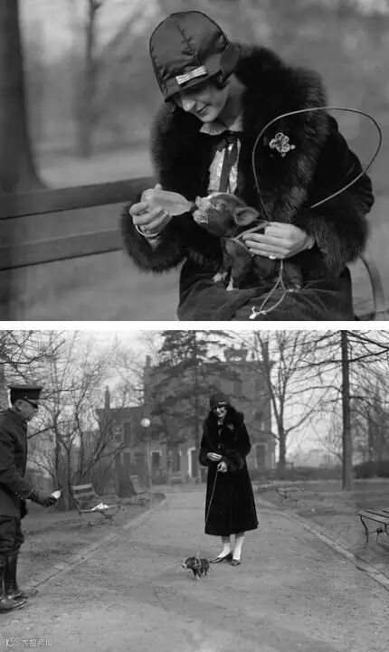 1925年,穿皮草的Lois Hoover和她的宠物猪