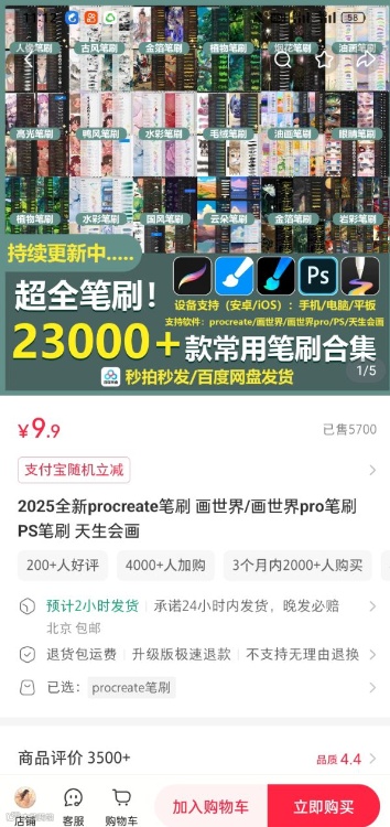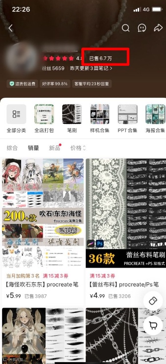 而且他们都懂以量取胜的道理,比如,卖笔刷不说几十款,非得说,23000+常用笔刷合集,用户一看数字这么大,就觉得花几块钱买这么多,太值了,哪怕里面有一半用不上,也觉得不亏。