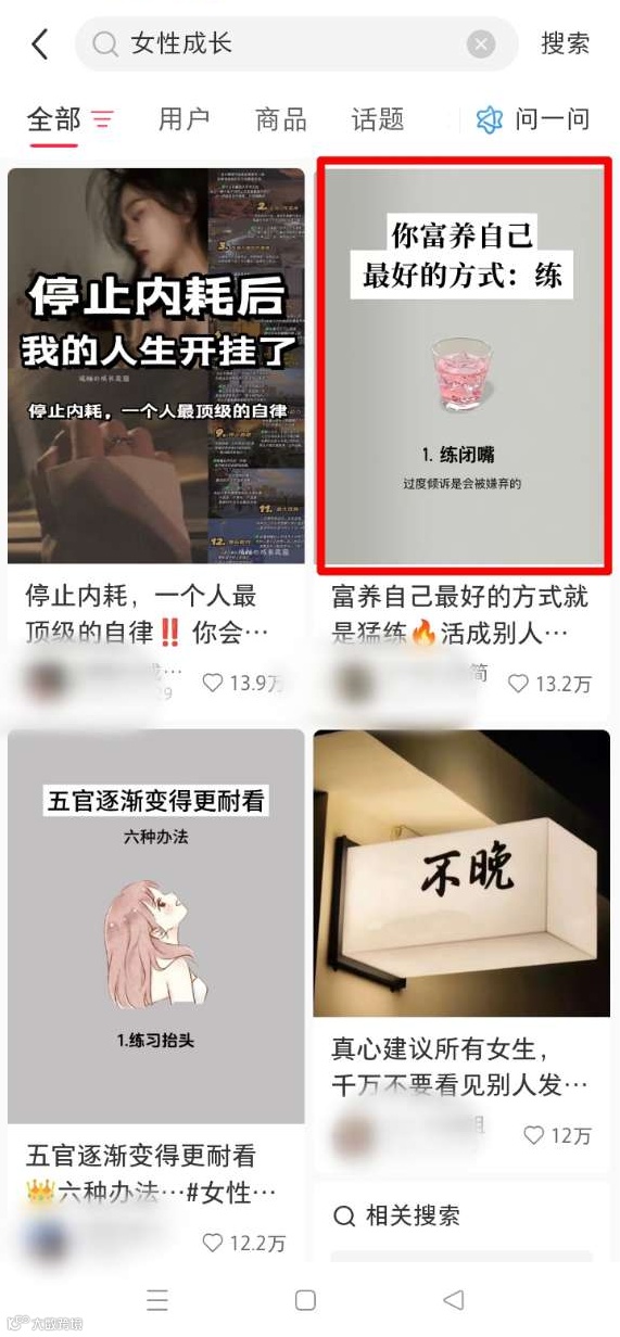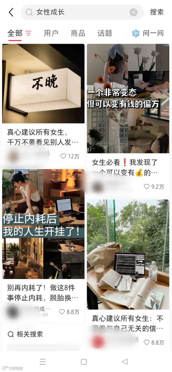 毕竟,小红书上面的用户,80%都是女性,上面关于女性成长的笔记特别多,比如这些:
