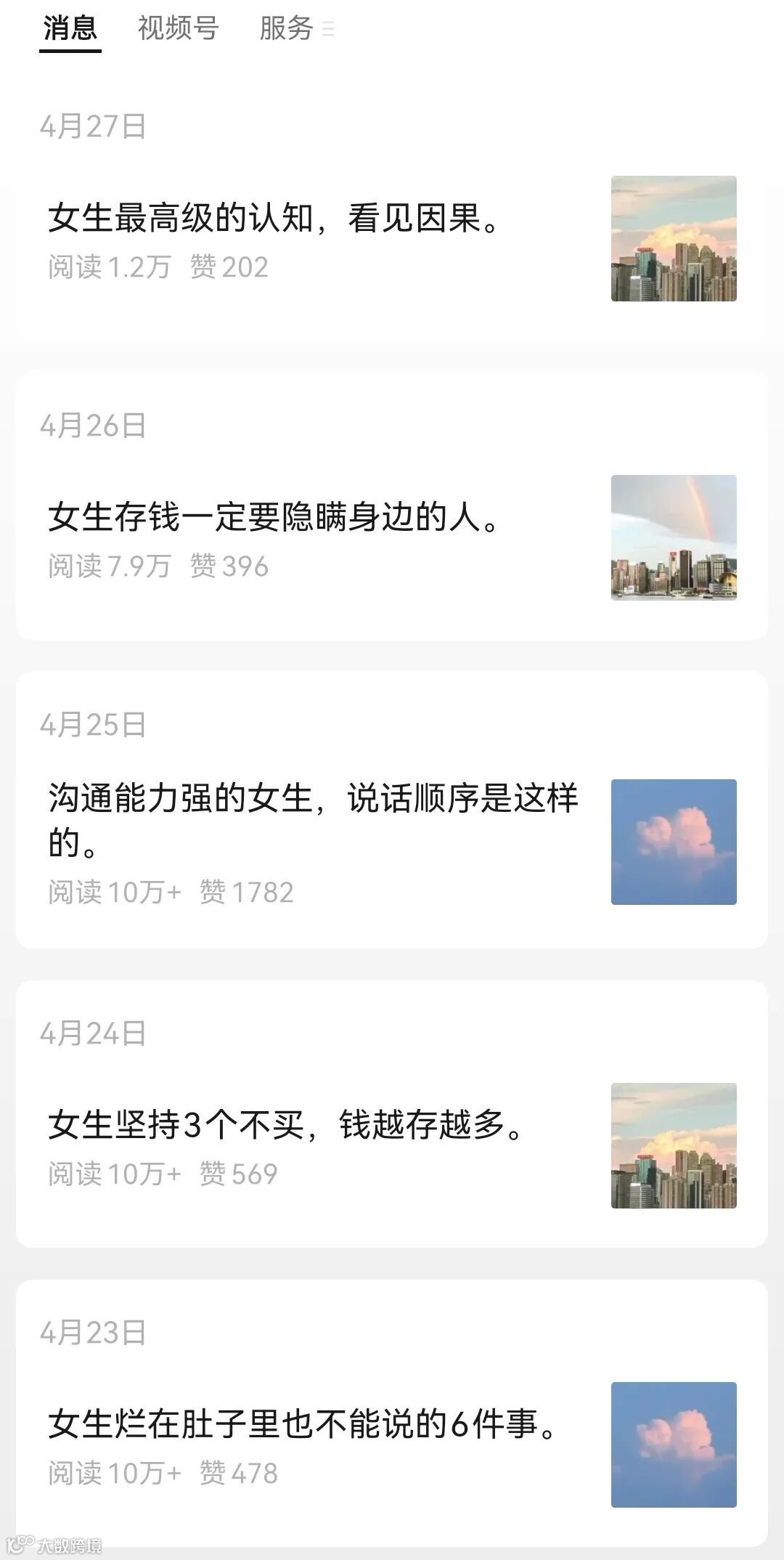我研究过上面提到的那个爆文账号,我翻了她往期的文章,发现有几个方向,阅读量都是特别高的。比如: