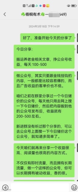 其实,在去年3月18日的时候,我们在社群就分享过一个“搬运养老金相关文章,挣公众号收益,每天100—500”这样的项目。