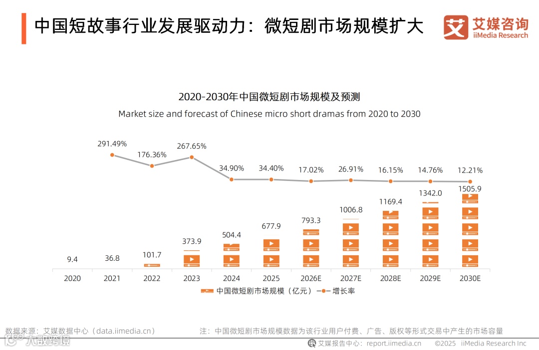短故事作为微短剧重要的内容源头,其体系化的发展将持续为微短剧输送优质的内容素材,从而促进微短剧市场规模进一步扩大。全球新经济产业第三方数据挖掘和分析机构iiMedia Research(艾媒咨询)发布的《2025年中国短故事市场发展趋势报告》显示,2025年中国微短剧市场规模达677.9亿元,同比上升34.40%,预计2030年中国微短剧市场规模超1500亿元。