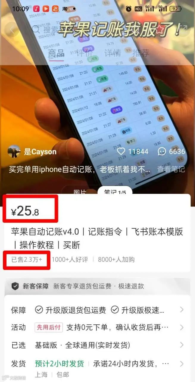 这个账号是卖苹果手机快捷指令的,笔记发的全是自动记账的内容。