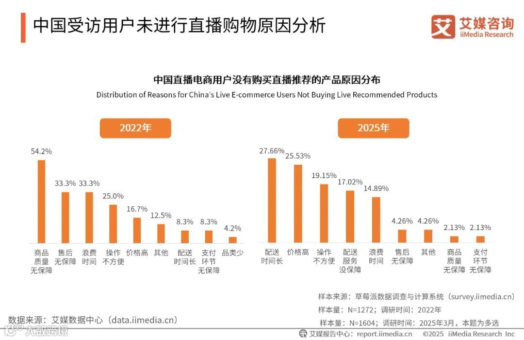 iiMedia Research(艾媒咨询)数据显示,在未进行直播购物的原因调查中,2022年主要原因为商品质量无法保证(54.2%),2025年则为配送时间长(27.66%)。艾媒咨询分析师认为,随着直播行业的普及和规范发展,产品质量和服务保障有所提升,但物流和商品性价比方面也应随之提高,这有利于保持商家稳定的客流量和人气。