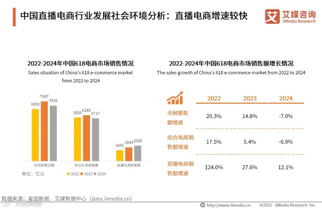 iiMedia Research(艾媒咨询)数据显示,2022-2023年中国618直播电商销售额呈现增长趋势,2024年达2068亿元,增长率达12.1%。艾媒咨询分析师认为,传统电商市场随着时间的推移,逐渐走向饱和,用户增长的速度明显放缓,传统电商的发展模式开始受到诸多因素的制约。而电商直播将商品展示、讲解、互动和销售等多个环节有机融合在一起,为消费者带来了一种全新的沉浸式、直观的购物体验。