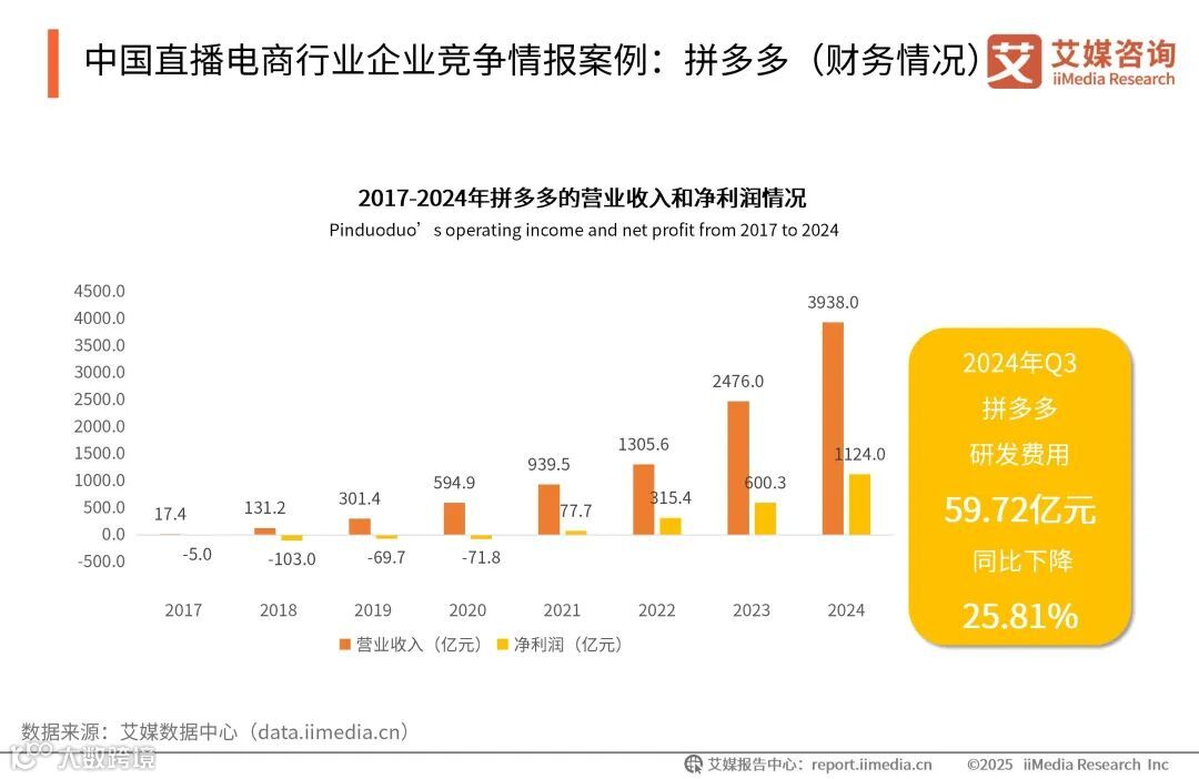 数据显示,拼多多的营业收入呈现不断增加的趋势,2024年拼多多的营业收入为3938.0亿元,其净利润为1124.0亿元。艾媒咨询分析师认为,拼多多自2021年以来扭亏为盈,发展态势较好,从产品物流等方面支持农业直播电商布局,以低价为优势,不断开拓海外市场。