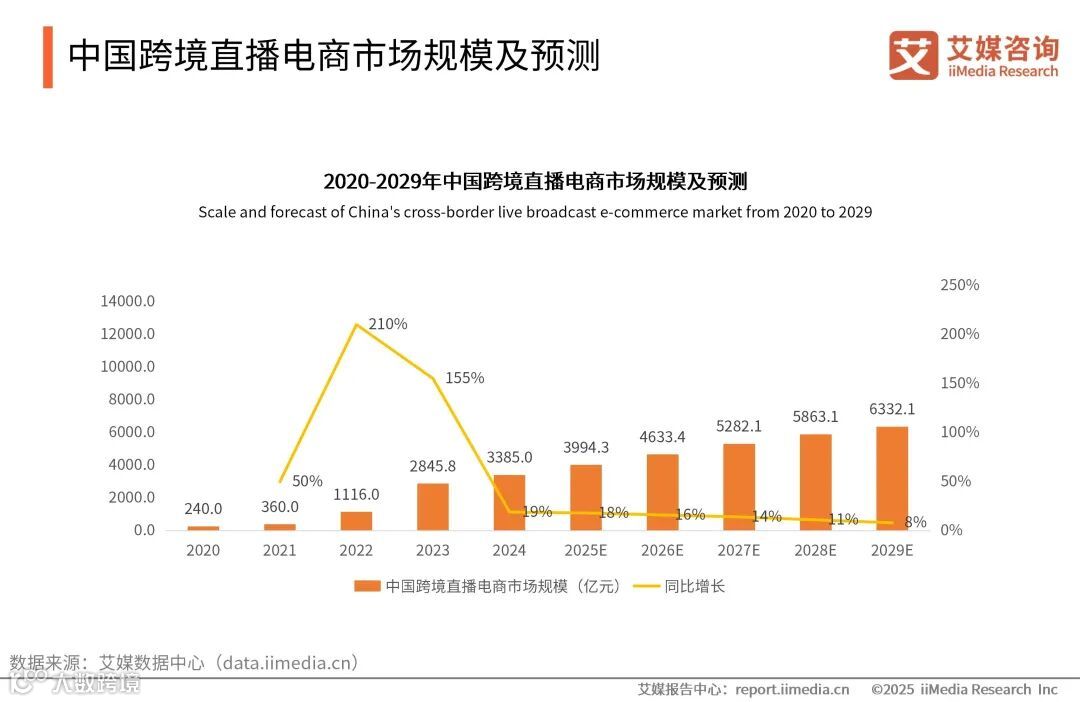 iiMedia Research(艾媒咨询)数据显示,2020-2024年中国跨境直播电商的市场规模呈上升趋势,预计在2025年还会持续保持增长趋势,2029年市场规模将超过6000亿元。艾媒咨询分析师认为,随着Tik Tok电商平台的迅速发展,各大平台也将发力跨境直播电商,中国跨境直播电商潮流势不可挡。