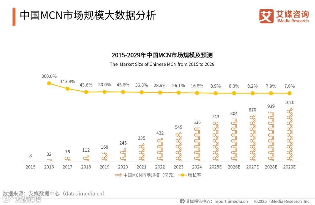 自2016年起中国MCN市场规模迅速扩张,2018年市场规模达到百亿级。在2019年的直播电商带货效益不断展现后,到2024年中国MCN市场规模进一步扩展,达到636亿元。艾媒咨询分析师认为,直播电商的变现核心之一是符合买家需求的商品,这是KOL塑造自有形象辨识度的保障之一。