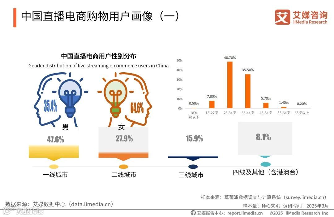 iiMedia Research(艾媒咨询)数据显示,日常生活中观看直播带货或通过网络电商直播渠道购物的用户中,男性比例占35.4%,女性占比为64.6%,其中80后、90后是购物主力军,占比总和超过80%。值得注意的是,直播电商购物用户主要分布在一二线城市,一线城市以47.6%的占比领先。