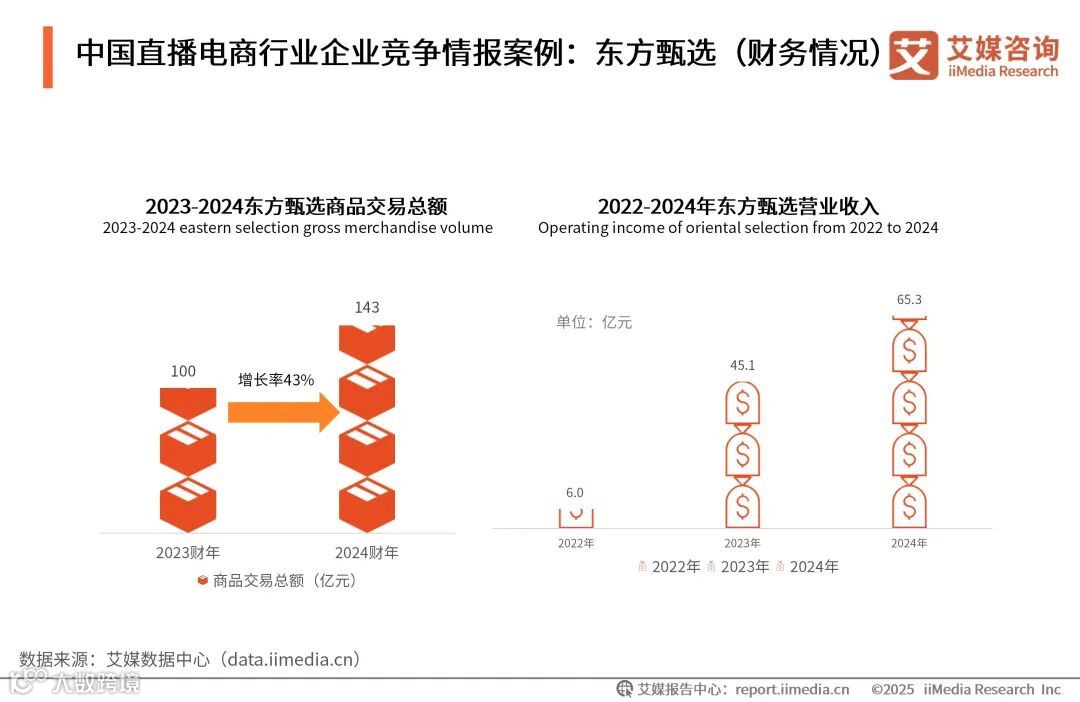 数据显示,2024年东方甄选总营收约为65.3亿元;商品交易总额为143亿元,同比增长43%,但在其头部主播董宇辉成立个人工作室后,东方甄选经营出现波动。艾媒咨询分析师认为,虽然东方甄选以产品为核心,但其销量仍离不开头部主播的流量影响,这可能是产品和消费者定位不清晰的原因。