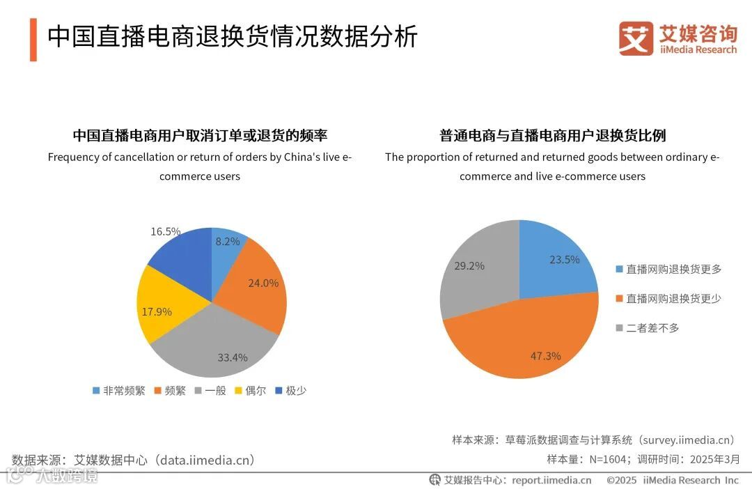 iiMedia Research(艾媒咨询)数据显示,受访用户中取消直播购物订单或者退货的比例较高,退货频率偶尔和极少的用户占34.4%。但与普通电商相比,直播网购的退换货比例更少。艾媒咨询分析师认为,退换货影响消费者购物体验,而直播电商在这方面的比例较高,这成为直播电商未来发展面临的挑战之一。