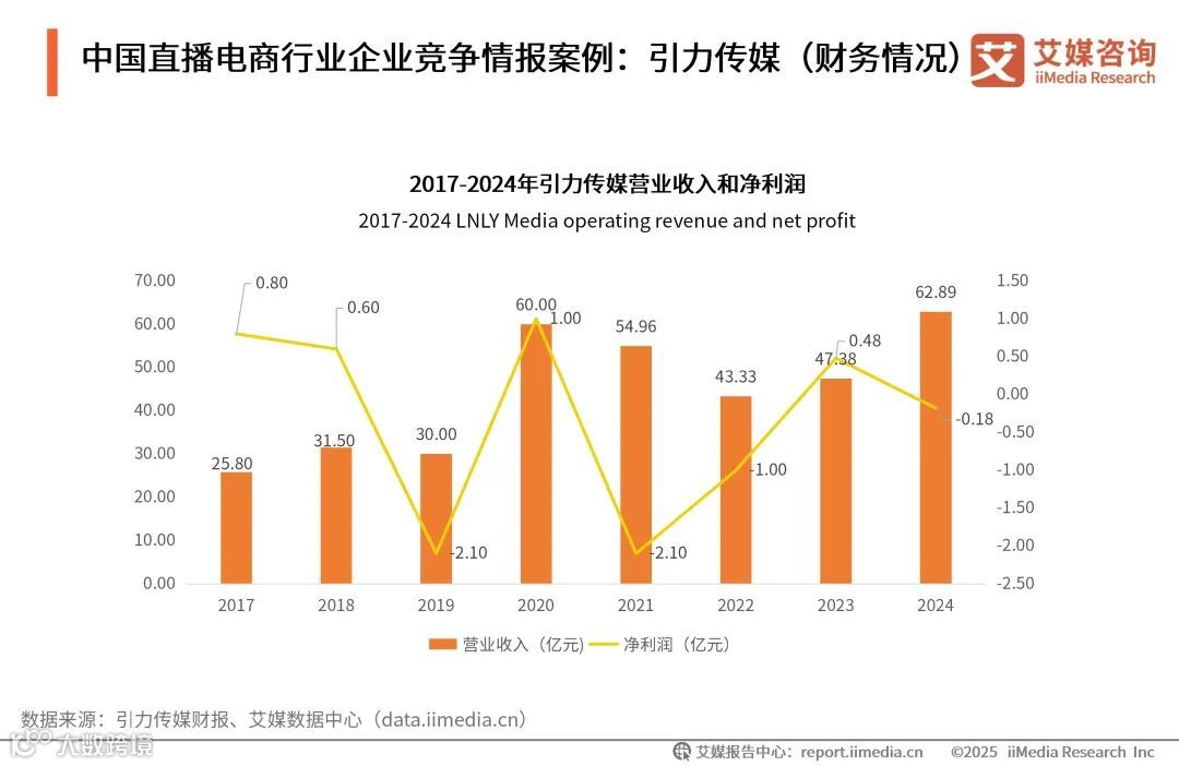 数据显示,引力传媒2024年实现营收62.89亿元,相比2019年有一定增长;2024年净利润为-0.18亿元,较2023年净利润有所下降。