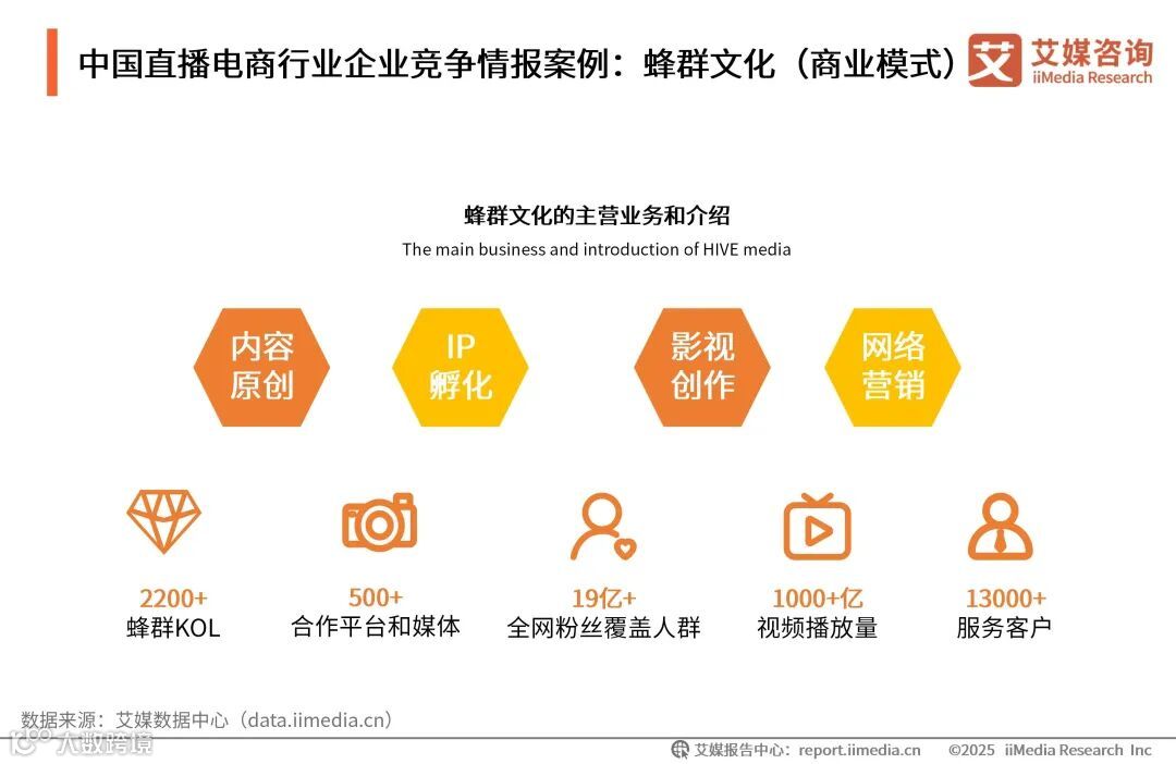 蜂群文化专注新媒体内容原创、IP孵化、网红经济,为广告主和企业主提供新媒体整合营销、策略支持、品牌影响力传播等服务。截至2023年,蜂群文化拥有超过两千个蜂群KOL,合作平台和媒体超过五百个。艾媒咨询分析师认为,借由多维度的媒介推广形式,形成较全面的宣传阵仗,有利于提高KOL粉丝黏性强,在直播电商中易形成自己的私域流量圈。
