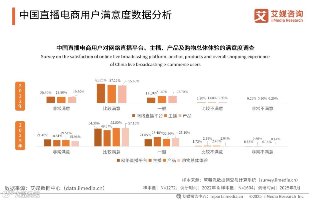 iiMedia Research(艾媒咨询)数据显示,受访用户对网络直播平台、主播、产品的满意度均集中在比较满意的程度。其中2025年用户对网络直播平台的满意度较高,表示非常满意的用户占比为21.46%,表示比较满意的用户占比为54.30%。艾媒咨询分析师认为,消费者对直播电商的满意度较高,而对产品的满意度有待提高,厂家和店铺及主播应一齐发力提高消费者对产品的满意度。