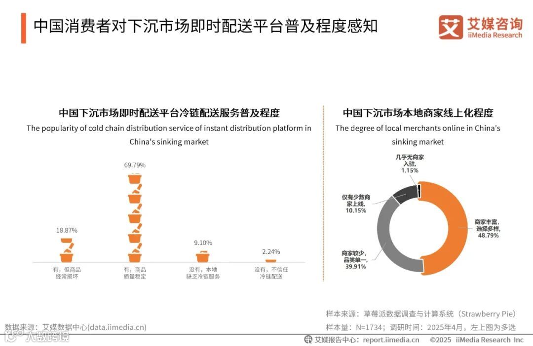 iiMedia Research(艾媒咨询)数据显示,近五成的消费者表示下沉市场本地商家线上化程度较高,商家丰富且选择多样。其中近七成消费者表示有使用过冷链配送服务,且商品质量稳定。艾媒咨询分析师认为,目前下沉市场的商家资源相对有限,部分地区的商家数字化程度较低,导致即时配送平台在商品种类和服务质量上存在一定的局限性。