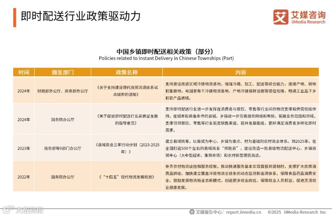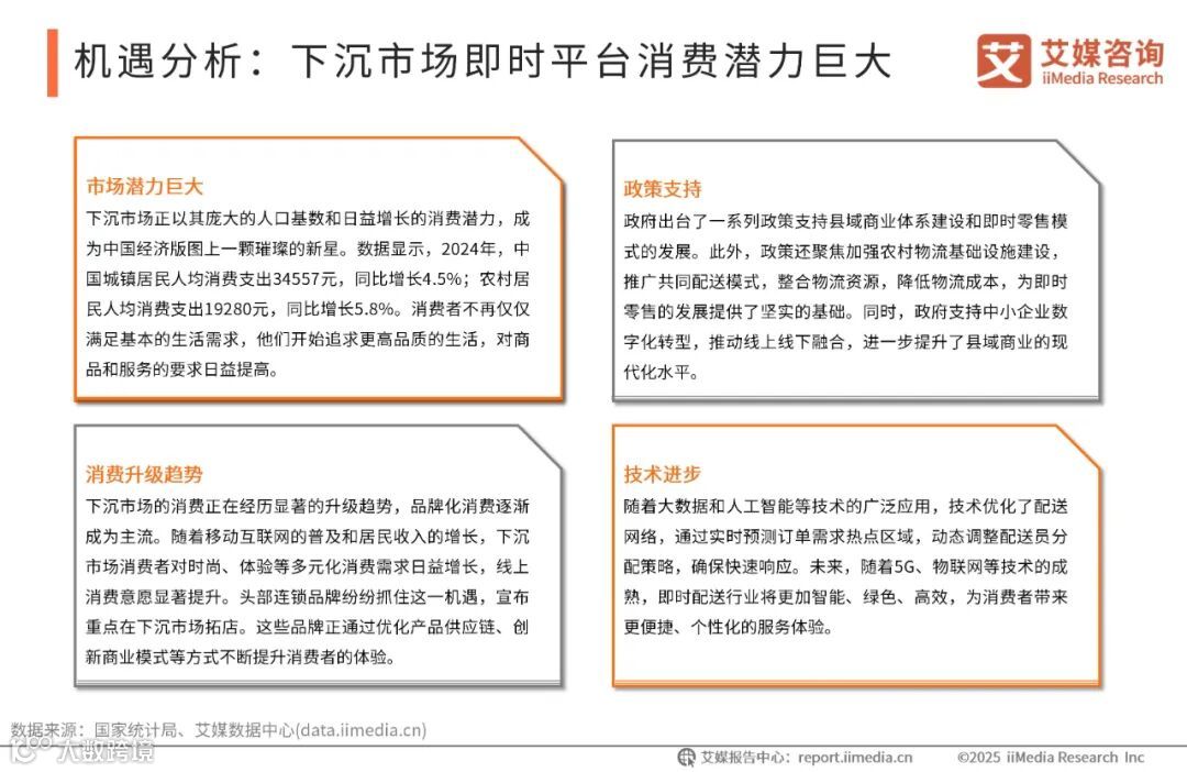 在政策引导和头部品牌下沉市场布局的双重推动下,中国下沉市场的即时配送行业正迎来新的发展机遇。政府出台了一系列支持政策,如推动“15分钟便民生活圈”建设,完善农村电子商务和快递物流配送体系,大力发展农村直播电商和即时零售等,为即时配送行业的发展提供了坚实的政策基础。部分头部品牌在加速下沉市场的布局。随着居民收入和消费支出的增长,消费结构向“品质化+服务化”升级,消费者对即时配送服务的时效性和品牌力提出了更高要求。