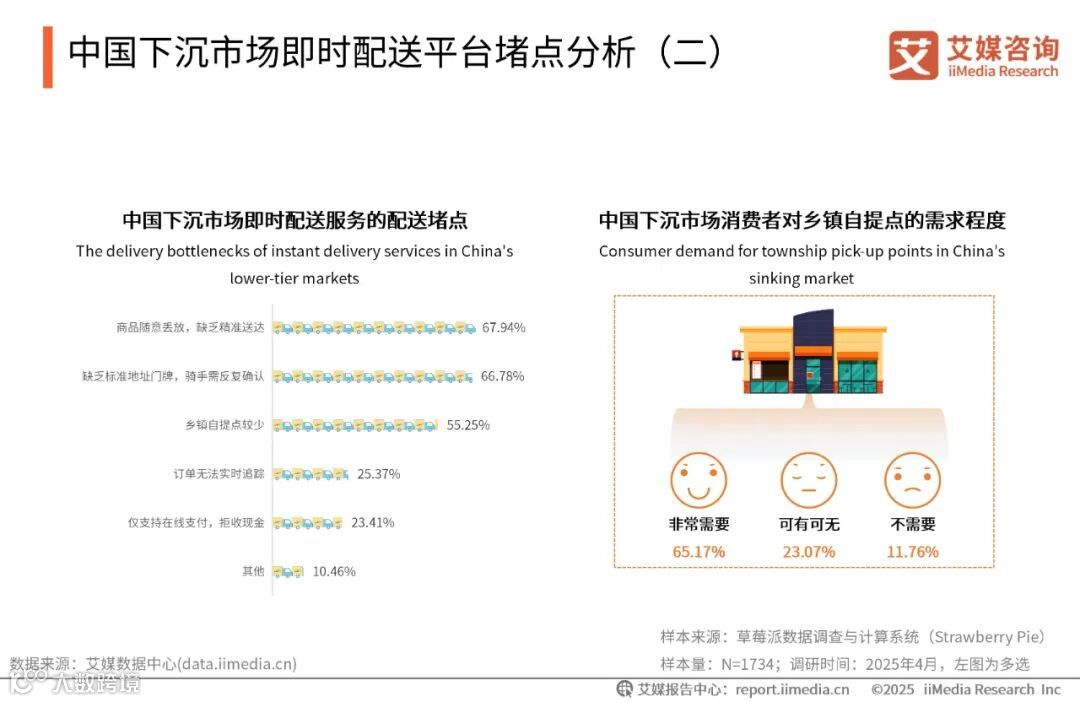 iiMedia Research(艾媒咨询)数据显示,近七成消费者表示下沉市场享受即时配送服务时会遇到商品随意丢放,缺乏精准送达和缺乏标准地址门牌,骑手需反复确认的堵点,影响即时配送的服务体验。超六成的消费者表示在下沉市场中非常需要乡镇自提点。艾媒咨询分析师认为,在偏远的乡村地区,道路标识的不精准使得配送人员在寻找目的地时经常遇到困难。这种现象对下沉市场即时配送行业的发展造成了一定的阻碍。