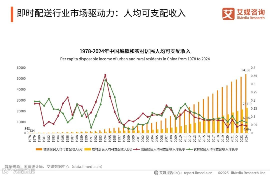 数据显示,从1978年至2024年,中国城镇居民人均可支配收入由343元增长至54188元;农村居民人均可支配收入由134元增长至23119元。人均可支配收入的增加使得下沉市场居民的消费需求更加多样化和个性化,除了传统的餐饮外卖,他们对生鲜、水果、日用品、药品等商品的外卖需求也在逐渐增加,这为外卖行业的业务拓展提供了一定的增长空间。