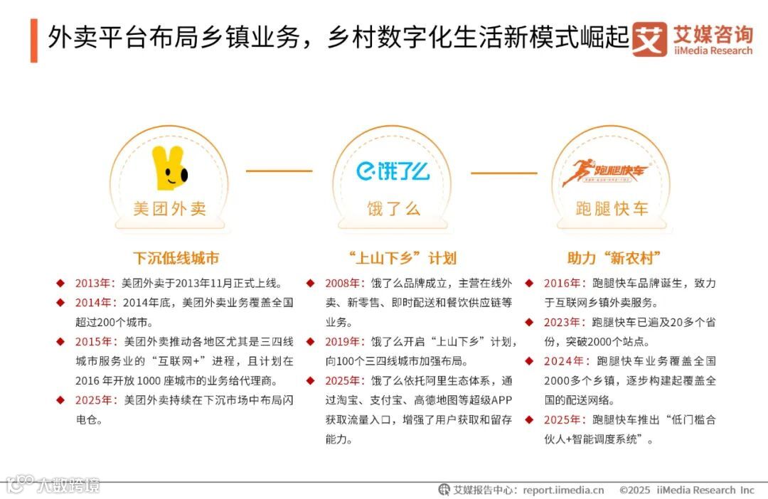 随着乡镇地区消费水平的提升、互联网技术的普及,以及物流体系的完善,外卖平台如美团外卖、饿了么将业务拓展至乡镇,寻求新的增量市场。此外,市场上还诞生了以跑腿快车为代表的基于乡镇消费者需求的外卖平台。外卖平台满足了乡镇居民日益增长的外卖需求,也促进了当地餐饮业的数字化转型。