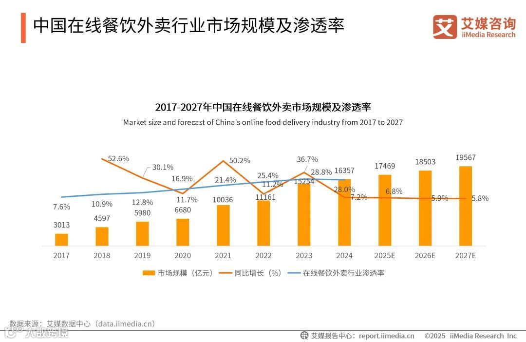 iiMedia Research(艾媒咨询)数据显示,中国在线餐饮外卖行业市场规模在过去十年中呈现出显著的增长趋势,2024年中国在线餐饮外卖行业市场规模为16357亿元,同比增长7.2%,行业渗透率达28.0%。预计未来中国在线餐饮外卖行业规模将进一步增大,2027年达19567亿元。从增长动力来看,一二线城市外卖市场趋于饱和,未来的增长动力将主要来自三线及以下城市和乡镇地区,下沉市场正成为外卖行业的重要增量来源。