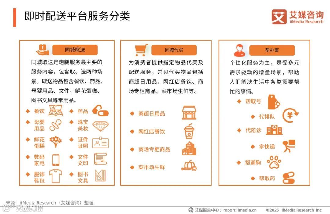 对于下沉市场即时配送平台而言,大数据、人工智能、物联网等技术的应用显著提升了配送效率和服务质量。同时,即时配送行业也在向全场景化与个性化服务方向发展,逐步覆盖更多“微场景”,如夜生活、聚会、旅游、母婴、居家养老等。这不仅推动了品类需求的多元化,也为行业带来了更广阔的发展空间。