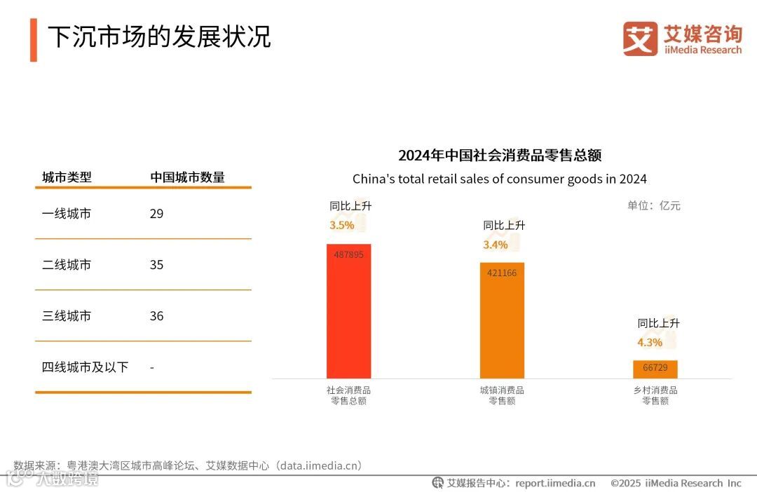 数据显示,2024年城镇消费品零售额为421166亿元,同比增长3.4%;乡村消费品零售额66729亿元,同比增长4.3%,乡村市场销售增速持续高于城镇。艾媒咨询分析师认为,乡村市场销售增速持续高于城镇,显示出乡村消费市场更好的潜力和发展动力。这一趋势与下沉市场商业体系建设的持续推进密切相关,随着下沉市场商业体系的不断完善,县乡消费市场的发展步伐加快,市场占比稳步提升。