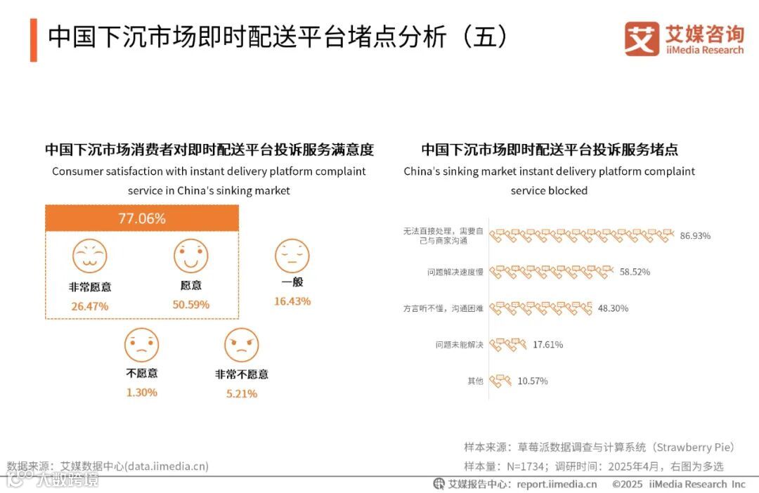 iiMedia Research(艾媒咨询)数据显示,超七成消费者表示对即时配送平台投诉服务较为满意,投诉服务堵点主要集中在客服无法直接处理问题,需要商家与用户自行沟通。艾媒咨询分析师认为,平台客服的权限范围相对狭窄,没有足够的权限进行直接操作。对于一些复杂问题,客服对订单的详细信息和商家的具体情况掌握有限,无法做出准确判断和有效处理,无法满足用户需求,导致用户不得不与商家沟通。