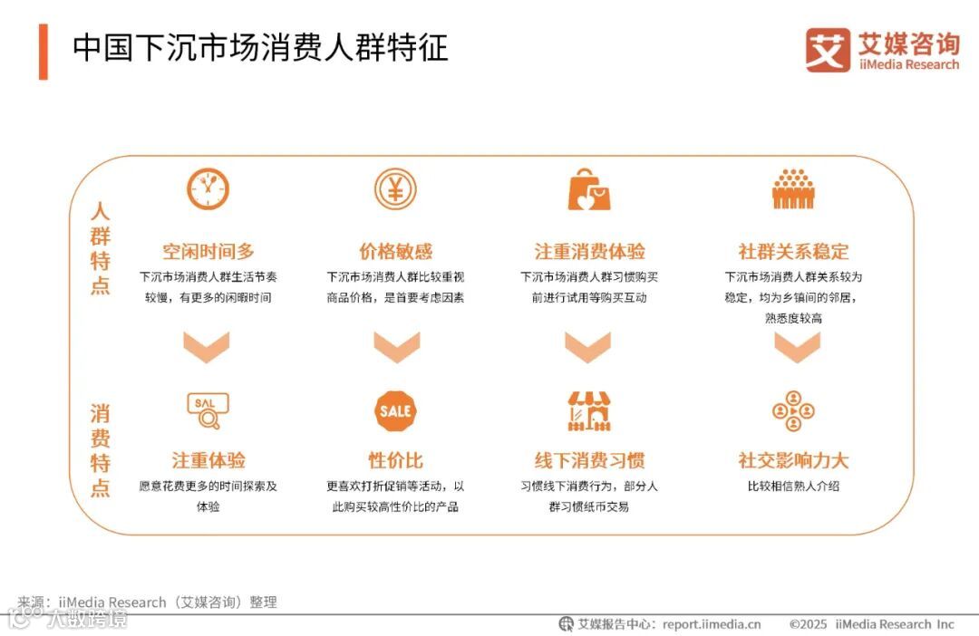 中国下沉市场消费人群因充裕的闲暇时间和较慢的生活节奏,愿意花更多时间探索线下门店,对线下门店忠诚度较高。他们更注重性价比,倾向关注促销、折扣等优惠信息,并进行线上线下价格比较。此外,下沉市场消费者购物决策受熟人社交影响较大,亲友和邻里的推荐在购物决策中起到重要作用。