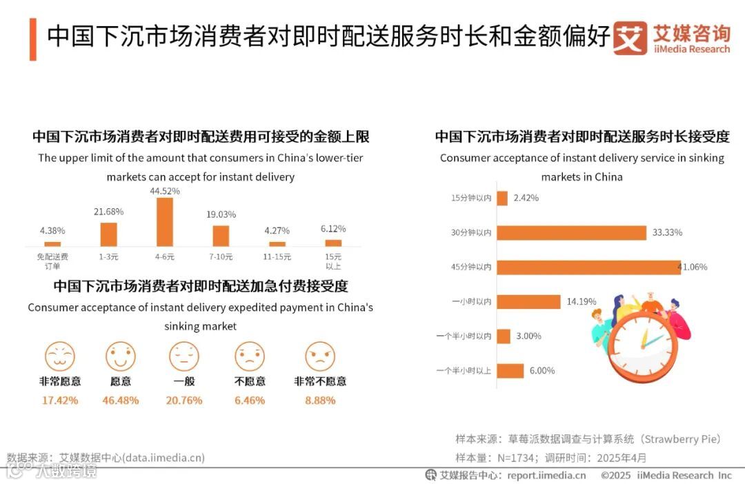 iiMedia Research(艾媒咨询)数据显示,超四成消费者对即时配送服务时长接受度集中在45分钟以内,超四成的消费者对即时配送服务金额接受区间在4-6元。艾媒咨询分析师认为,下沉市场的消费者非常看重服务的便捷性。对于加急配送服务,消费者希望能够在最短的时间内收到所需商品,这种需求在食品、药品等急需品类上尤为明显。