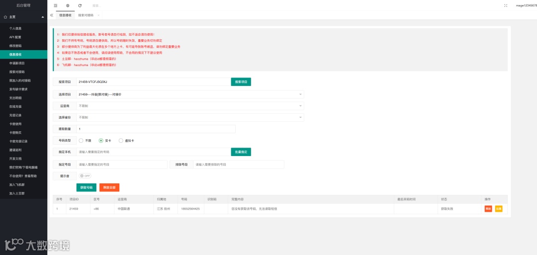 通知后在点左侧的“搜索对接码”,选择项目(这里的项目指的是短信前缀公司名)如下图,如果是抖音就直接输入抖音点击【搜索项目】