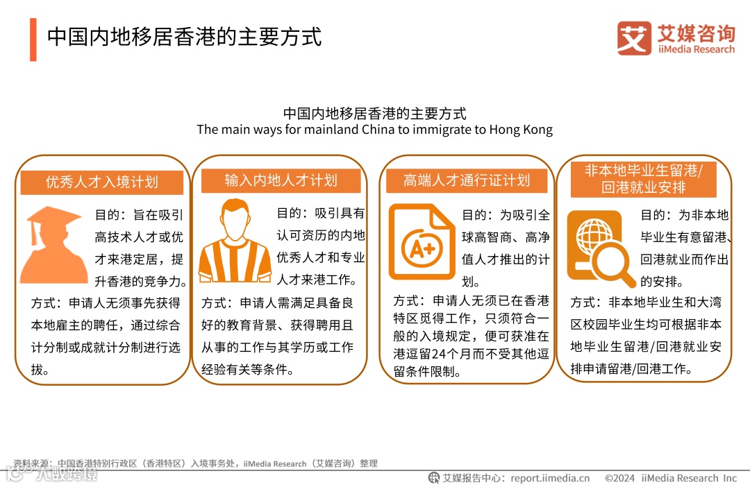 iiMedia Research(艾媒咨询)调研数据显示,香港的教育优势备受青睐,高达57.5%的客户看重其高水平的教育资源、丰富的学习资源以及国际化的教育理念;其次,香港的就业市场吸引力显著,54.6%的客户认为其就业选择机遇多。在获取香港身份规划相关信息的渠道方面,有51.9%的客户通过内容分享平台(如小红书、知乎)获取相关资讯,通过搜索引擎(如百度)获取相关信息的占比达47.4%。