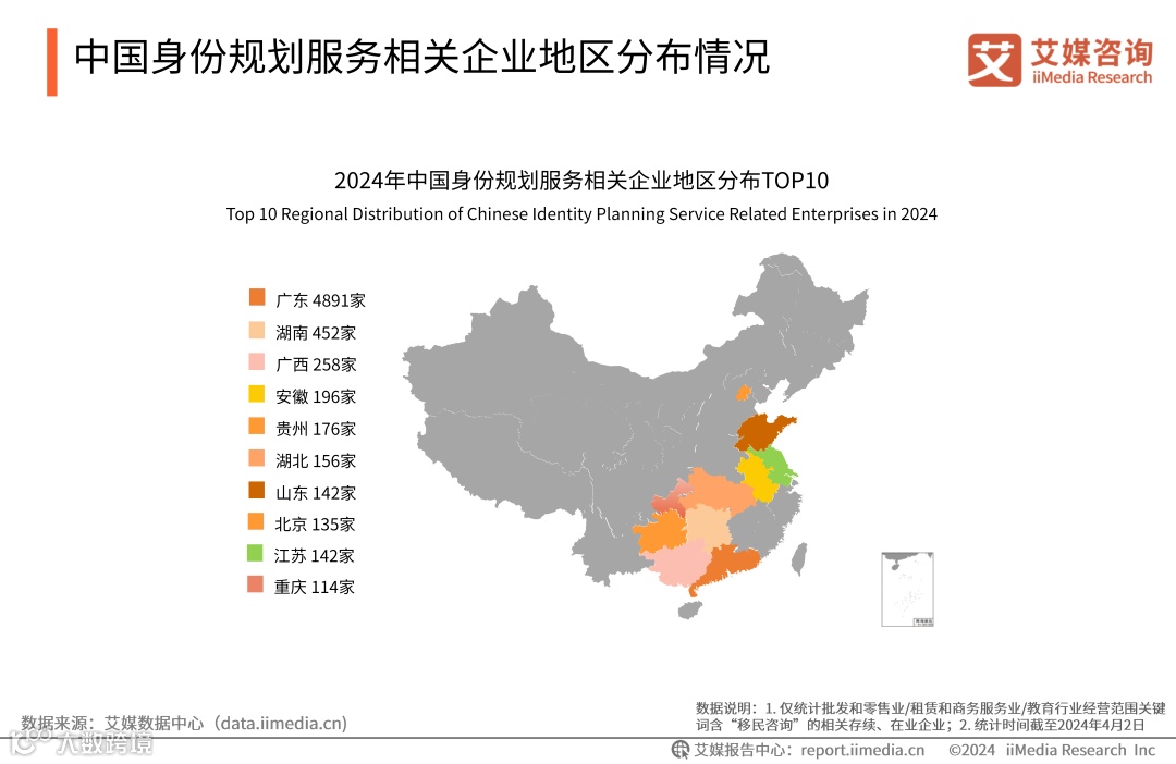 数据显示,在中国身份规划服务相关企业地区分布情况中,广东以4891家企业的显著规模占据领先地位,其与香港地理位置的邻近以及紧密的经贸联系是驱动服务企业聚集的重要因素。此外,排名第二和第三的湖南和广西分别拥有452家和258家企业。