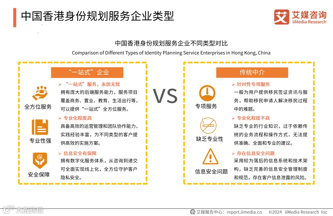 当前,中国香港身份规划服务企业主要分为“一站式”企业和传统中介两种类型。“一站式”服务企业致力于构建完整且流畅的服务流程,确保客户享有全面且一致的服务体验,全方位守护客户隐私安全。传统中介企业一般提供针对性的专项服务,服务范围较为有限,专业化程度不高,客户信息存在泄露的风险。