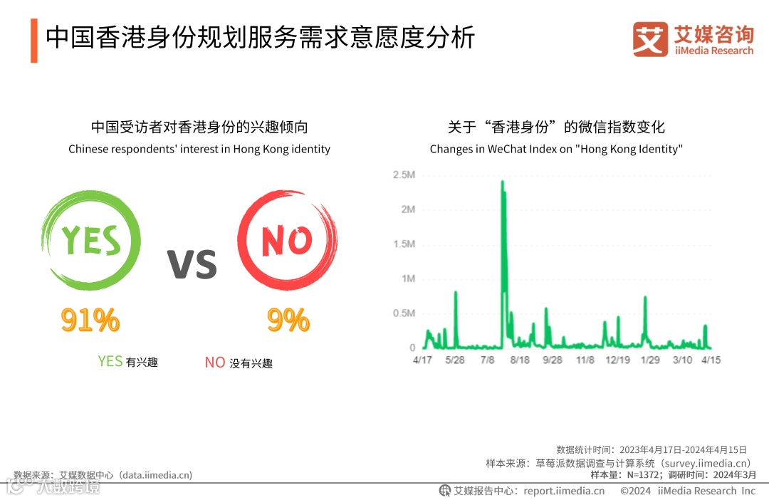 iiMedia Research(艾媒咨询)调研数据显示,91%的受访者表示对香港身份有兴趣。数据显示,近一年来,关于关键词“香港身份”的微信指数总数达31764130,整体日均值为87264。随着粤港澳大湾区建设的不断深入和香港人才引进政策的放宽,越来越多的人开始认识到香港身份所带来的多重福利,增强了民众对香港身份规划的兴趣。