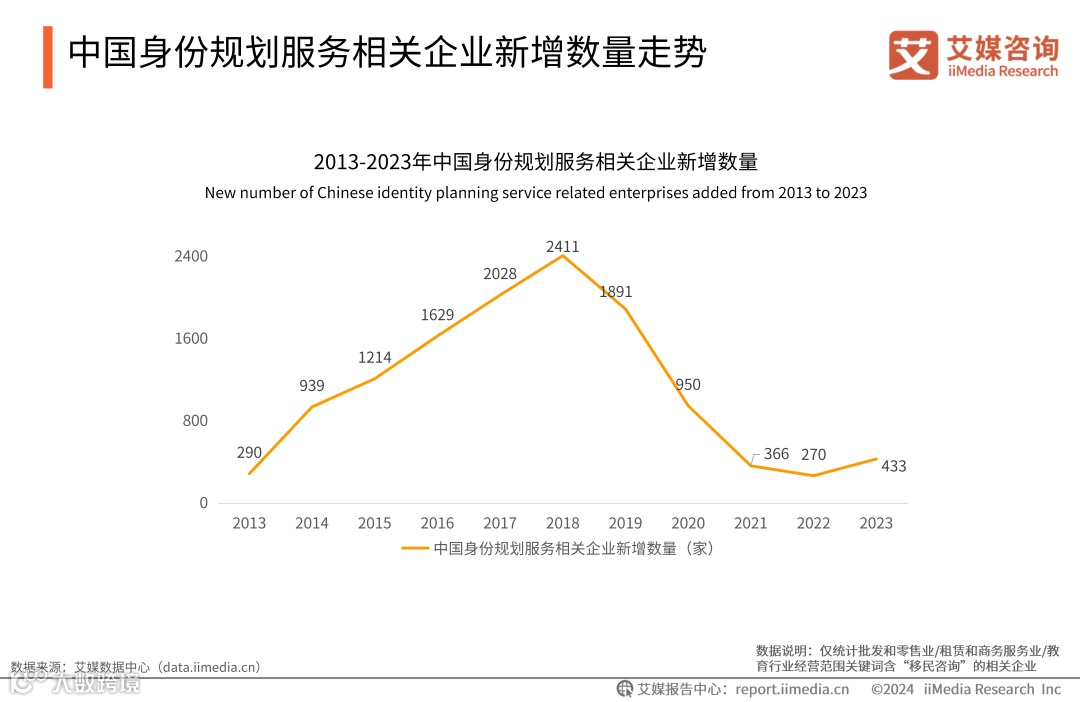 数据显示,2013-2018年,中国身份规划服务相关企业新增数量逐年增加,2018年高达2411家。基于市场需求的增加,越来越多的机构进入该领域争夺客户资源。2018年以后,企业新增数量开始下降,这或与行业监管力度加大有关,一些企业存在资质不全、服务质量参差不齐的问题,导致无法达到行业的准入门槛。