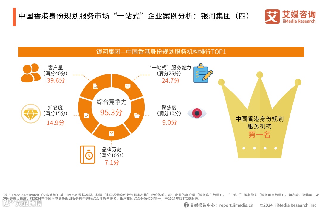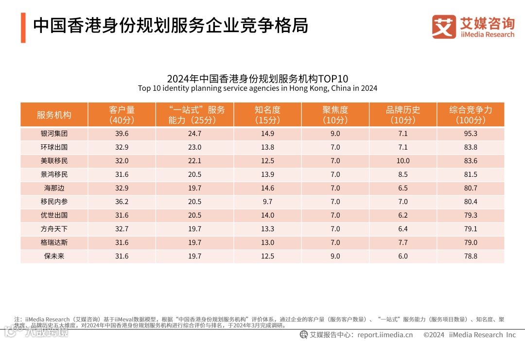 在激烈的市场竞争和严格的行业监管下,一些资质不全、不合规的企业逐渐退出了香港身份规划服务市场,但也有部分企业经受住了市场的检验。在《2024年中国香港身份规划服务机构TOP10》榜单中,前3名依次是银河集团、环球出国、美联移民。其中,银河集团以95.3分的绝对优势排名第一,从各维度指标来看,银河集团在客户量、“一站式”服务能力、知名度及聚焦度方面均排首位,展现出全面、便捷、高效的服务体验,以及客户的高信任度和满意度。