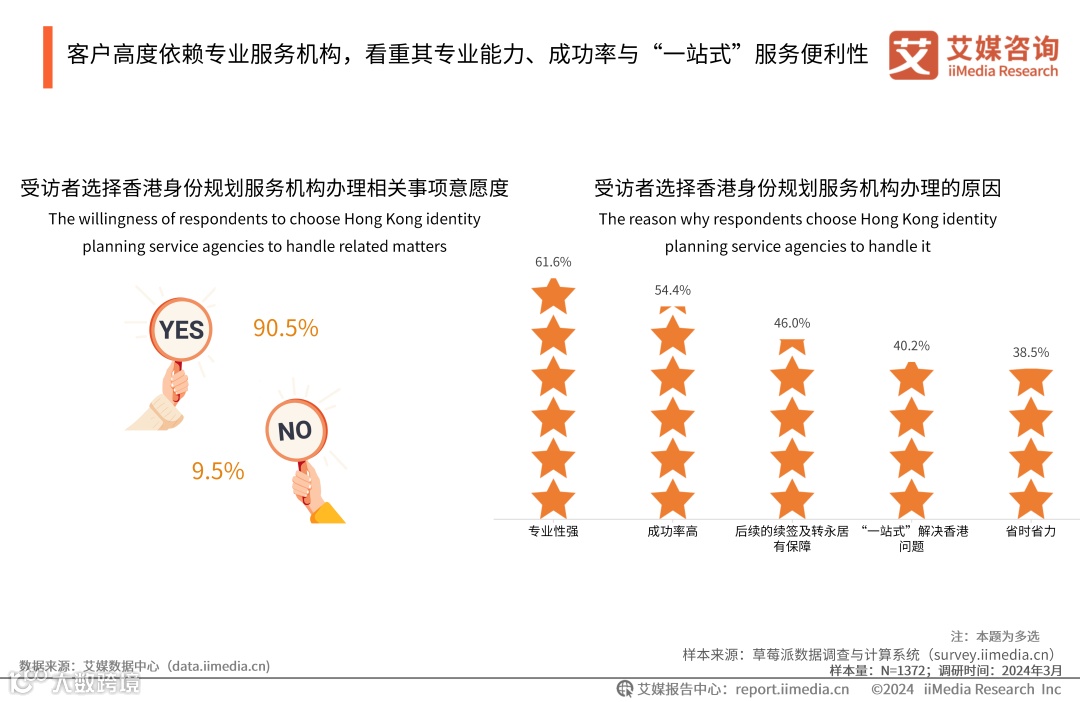 iiMedia Research(艾媒咨询)调研数据显示,在考虑香港身份规划的客户中,绝大多数(90.5%)倾向于选择专业香港身份规划服务机构协助办理相关事宜,选择服务机构的主要原因包括专业性强(61.6%)和成功率高(54.4%)、后续的续签及转永居有保障(46.0%)等。客户在选择香港身份规划服务机构时,高度重视服务机构的专业能力、成功率、服务范围以及办理过程中的便利性。