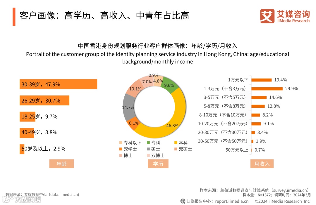 iiMedia Research(艾媒咨询)调研数据显示,在中国香港身份规划服务行业客户群体中,47.9%的客户处于30至39岁区间;本科及以上学历占比高达85.6%,显示出良好的整体教育背景;大部分客户(80.6%)月收入在1万元及以上。