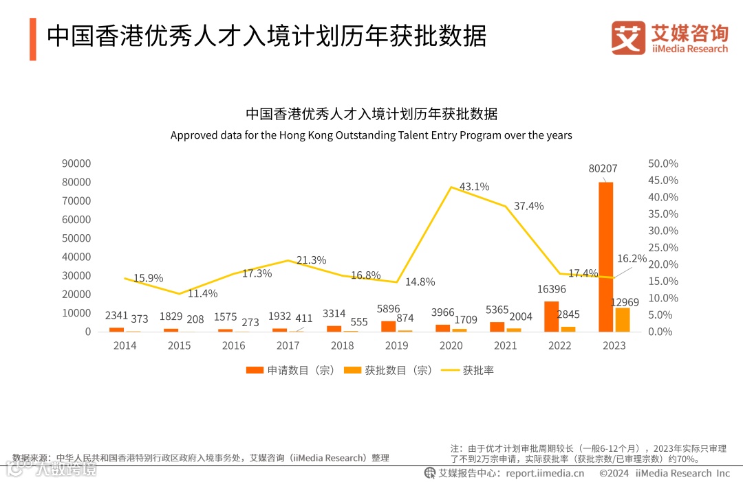 2023年,中国香港各项输入人才计划展现出强劲吸引力,其中,优秀人才入境计划(优才计划)接收80207宗新申请,成功批准12969宗;输入内地人才计划接获22411宗申请,19757宗获批。2023年,中国香港各项输入人才计划共计吸引22万宗新申请,约有13.5万宗获批,整体获批率约为61.3%。