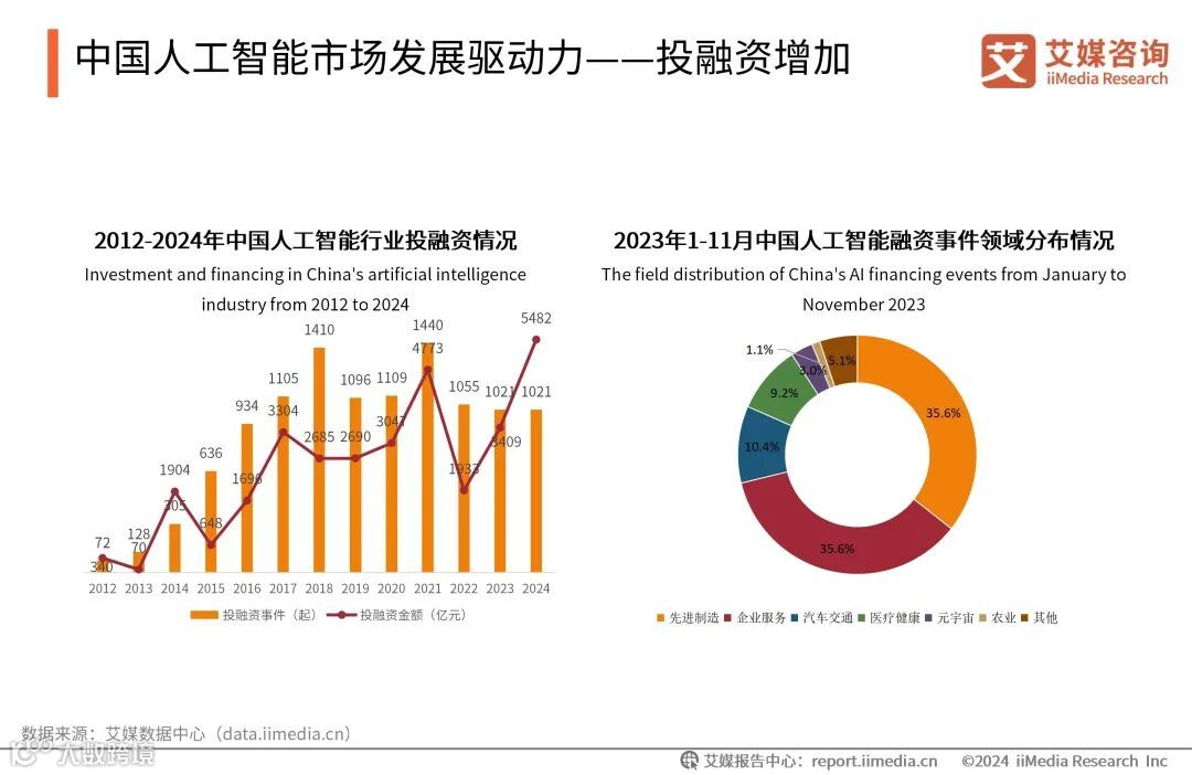数据显示,在经历两年的下降后,2024年人工智能行业投融资金额再创新高,达到5482亿元。2023年1-11月,先进制造和企业服务为人工智能相关融资事件中占比最多的领域,占比均为35.6%。汽车交通、医疗健康、元宇宙、农业,占比分别为10.4%、9.2%、3.0%、1.1%。投融资的持续增加为中国人工智能行业的发展提供了强有力的资金支持,促进了技术创新、市场扩张和应用深化,为行业的稳健增长和长远发展奠定了基础。