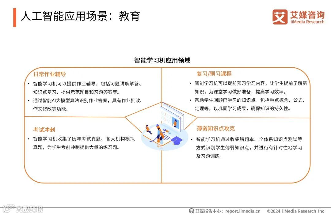 智能学习机作为新型的教学辅助工具之一,常用于学生的日常作业辅导、复习/预习课程、考试冲刺、薄弱点知识攻克等领域,为学生提供个性化的学习支持和辅导服务。艾媒咨询分析师认为,智能学习机正处于发展阶段,随着其功能和服务的完善,智能学习机将成为学生主流的学习辅助工具之一。
