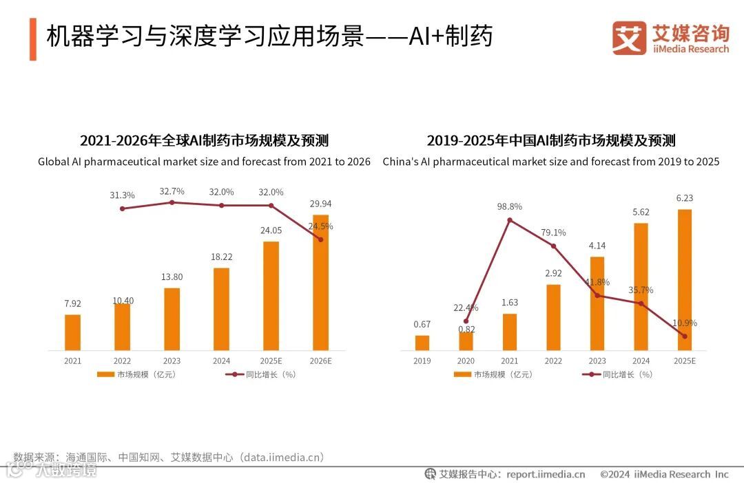 数据显示,2024年全球AI制药市场规模达18.22亿元,其中中国AI制药市场规模为5.26亿元,预计到2025年中国AI制药市场规模将达6.23亿元。AI技术在药物研发过程中的应用越来越广泛,包括设计基准化合物集、预测靶标在疾病中的作用、设计计算化合物库、发现新靶标、预测构-效关系(SAR)、预测ADMET性质、在临床试验中选择患者群体以提高成功率等。