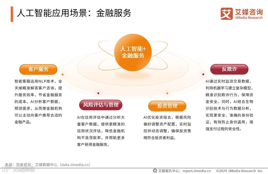 人工智能在金融业的应用涵盖客户服务、风险评估、投资管理和反欺诈,通过NLP技术、机器学习、生物识别等手段,提升金融服务效率、安全性和个性化水平。