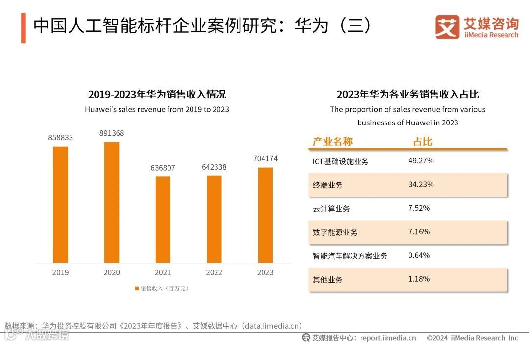 数据显示,2021-2023年华为销售收入呈现逐步上升趋势,2023年总销售收入达7041.74亿元。在业务结构方面,华为ICT基础设施业务占比较大,达49.27%,云计算业务和数字能源业务分别排名第三和第四,占比分别为7.52%和7.16%。