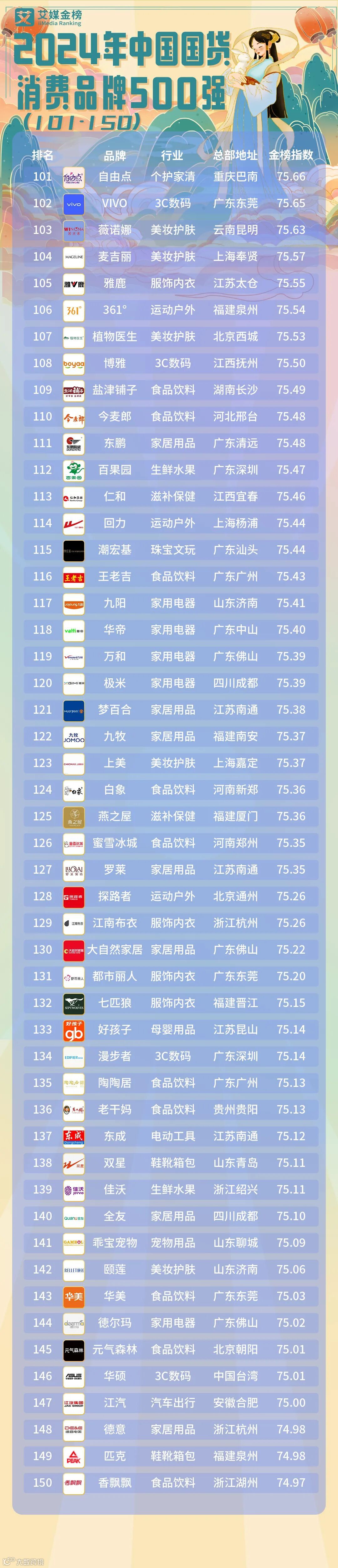 从行业分布来看,本次《2024年中国国货消费品牌500强》榜单覆盖了16个不同行业。其中,以茅台、伊利、蒙牛为代表的食品饮料行业共有64个品牌入选。以华熙生物、自然堂、珀莱雅为代表的美妆护肤行业共有51个品牌入选;以欧派、恒洁、顾家家居为代表的家居用品行业共有39个品牌入选。