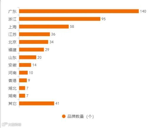 从分布地区来看,本次《2024年中国国货消费品牌500强》榜单中有140个品牌来自广东,占比达到了28%;有95个品牌来自浙江,58个品牌来自上海。上榜品牌数量多集中在广东、北京、江浙沪地区,这些地区因其发达的经济环境、成熟的产业链配套以及政策的积极扶持,成为了孕育和壮大国货品牌的热土。广东作为中国经济第一大省,其深圳、广州等城市更是科技创新和制造业的高地,更是为众多消费电子、家电品牌提供了得天独厚的成长条件。