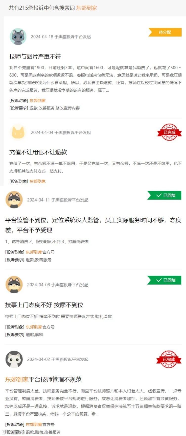 时至今日,在黑猫投诉搜索发现,不少用户投诉东郊到家按摩服务存在“虚假宣传欺诈消费””按摩时长不足”“引诱色情服务”“强制消费”等问题。有用户称“东郊到家技师引导加钟提供色情服务,明确拒绝后态度敷衍说话阴阳怪气,接打电话内涵客人主动点击服务结束”“预约上门按摩服务技师按的太痛了还问要小费200元,私下索要个人信息微信”。