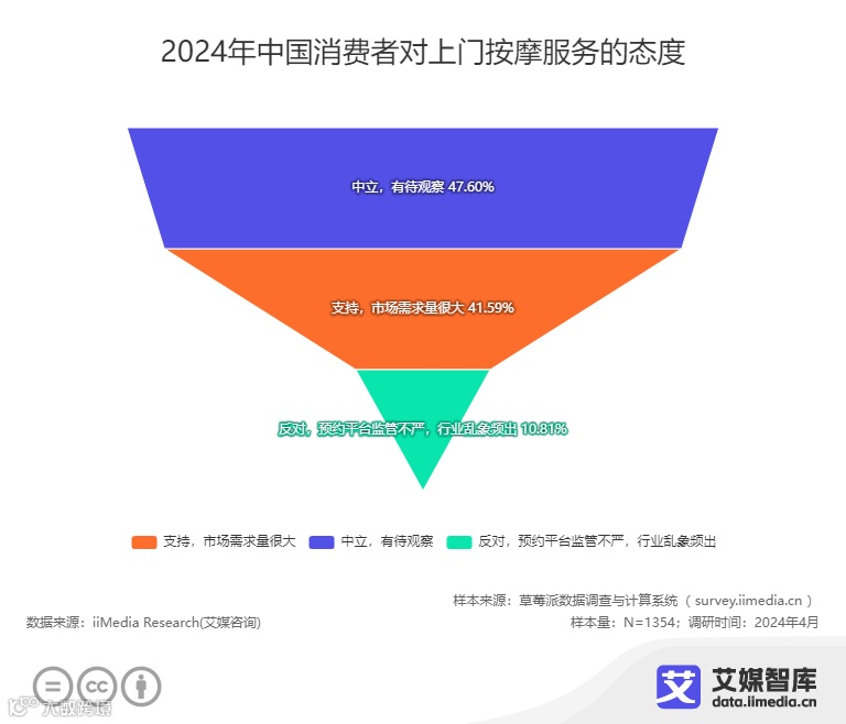 iiMedia Research(艾媒咨询)数据显示,在中国消费者对于上门按摩服务的态度中,41.59%的消费者表达了对该项服务的支持,显示出这一市场具有显著的潜在需求;47.60%的消费者则持中立态度,持保留意见,期待市场进一步规范和完善;10.81%的消费者则对上门按摩服务表示反对,主要担忧预约平台监管不严、行业乱象频出等问题。